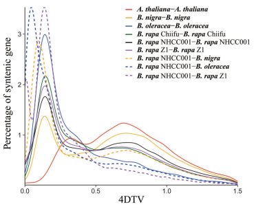由于在同一基因組上共線性的染色體片段中有旁系同源的基因集,因此可以通過這些成對的共線性片段追溯目的物種曾經的復制事件。通過研究全基因組復制事件,可以確定物種發生全基因組倍增時間,同時也通過分化時間的比對來判斷復制是發生在分化之前還是分化之后。常用方式:KS/4DTV
