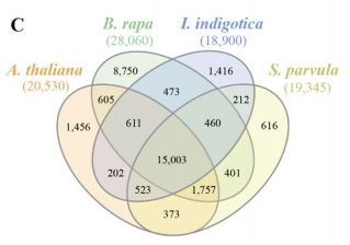 基因家族(gene family),是來源于同一個祖先,由一個基因通過基因重復而產生兩個或更多的拷貝而構成的一組基因,它們在結構和功能上具有明顯的相似性,編碼相似的蛋白質產物。對物種的蛋白序列進行家族分類,對獲得基因家族進行注釋;對本物種的特有基因家族進行GO和KEGG富集分析。物種共有基因家族中的單拷貝同源基因數目,用于系統發育樹的構建等分析。Veen圖中非重疊區與重疊區的數量分別表示幾個物種間特有基因家族和共有基因家族的數量。