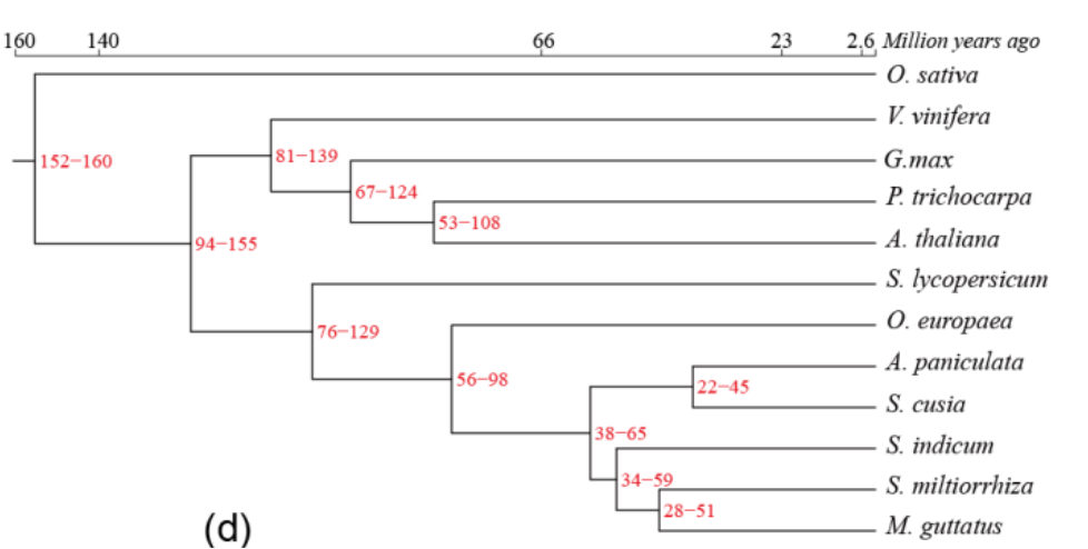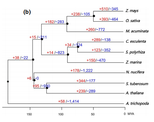 (8)全基因組復制事件加上前期已有研究物種或是研究較為清晰的物種作為比對(葡萄或無油樟可作為內參)。