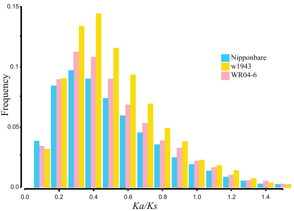 選擇壓力是指外界施加給某物種生物進化過程中的壓力,使得物種適應自然環境。在遺傳學中,Ka/Ks或者dN/dS表示的是異意替換(Ka)和同意替換(Ks)之間的比例。一般認為,同義突變不受自然選擇,而非同義突變則受到自然選擇作用。如果Ka/Ks>1,則認為有正選擇效應。如果Ka /Ks=1,則認為存在中性選擇。如果Ka/Ks<1,則認為有純化選擇作用。如2019年百邁客合作發表于《Molecular Plant》文章雜草稻基因家族聚類圖例所示:ka/ks值在1.4到1.5之間,雜草稻(WR04-6)比野生稻(w1943)含有更多的基因;明雜草稻基因組中的基因可能積累了比栽培稻更多的功能突變,這意味著雜草稻的半馴化導致了雜草的進化。
