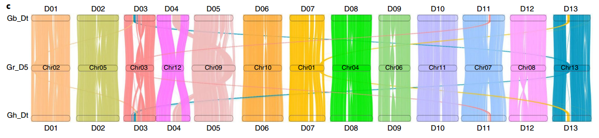 如2018年百邁客合作發表于《Nature Genetics》陸地棉與海島棉基因組文章圖例所示:海島棉染色體D05和陸地棉D12中均存在大的染色體臂間倒位,暗示這些變異出現在多倍化之后;兩個四倍體相對于G. raimondii共有一些結構變異,例如染色體D09中兩個四倍體發生了大的反轉。?