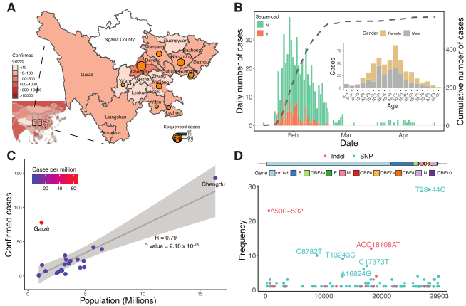 與20家醫院和研究機構合作,分析了在2020年1月22日至2月20日期間在中國四川省收集的流行病學、遺傳和臨床數據。2020年1-2月底,四川省經qPCR檢測確診病例538例,其中成都病例占28.8%(圖1A)。四川確診病例呈指數增長,2020年1月30日達到高峰,每天新增確診病例38例(圖1B)。若人員更密集,發生病例的頻率更高(圖1C),表明社交距離可能是防止病毒傳播的一個關鍵因素。
