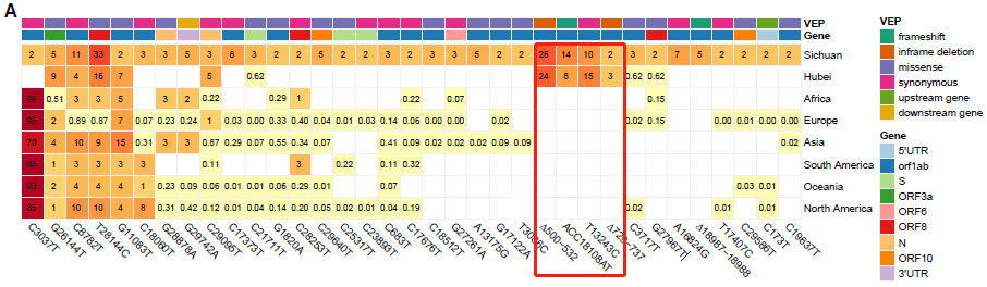 對截至2020年11月9日存放在GISAID上的81391個高質量公共基因組序列進行分析,其中35個snp中有29個(82.8%)來自其他大洲;一些變異(C3037T、G26144T、C8782T、T28144C、G11083T和C18060T)在歐洲、非洲、大洋洲和美國流行,表明大多數snp已經在世界范圍內流行。與武漢人群的比較顯示,四川和武漢都存在另外四種變體,這些復發型包括三個Indels:Δ500-532, ACC18108AT和Δ729-737;一個SNP:T13243C(圖2A),表明這些變異可能是從武漢輸入的,與四川患者的旅行記錄一致。