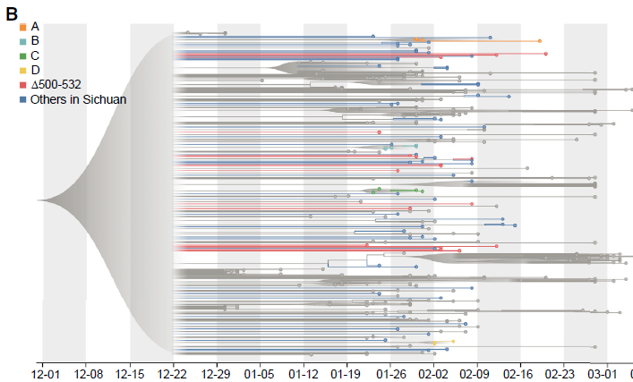 值得注意的是,在Nsp1編碼區有兩個缺失,Δ500-532和Δ729-737,在四川觀察到23例(26%)和2例(2.2%);在武漢觀察到39例(24%)和4例(3%)。對Δ500-532的基因組進行了研究,發現它在系統發育樹的不同簇中分布稀疏(圖2B)。結果表明Δ500-532發生在多個城市,并可能從武漢多次輸入,這與缺失Δ500-532的四川患者中有83.3%的人有去過武漢的旅行史相一致。