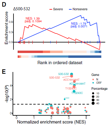 采用類似GSEA的分析方法,來鑒定一個突變體是否富集嚴重/非嚴重的臨床表型。發現Δ500-532與ESR等嚴重相關表型呈負相關。基于有/沒有某種變異類型,將病例分為兩組,發現感染Δ500 -532病毒的患者在所有檢測的35種變異中Ct值最高(圖3E)。