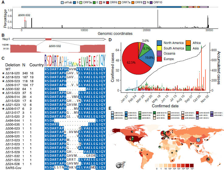 計算了SARS-CoV-2基因組中每個堿基對的缺失頻率,Δ500-532位點是第五大最常見的缺失區域(圖4A)。測序結果支持高序列深度的缺失,并通過Sanger測序驗證了缺失(圖4B)。從GISAID的37個國家的922例病例中,在Δ500-532位點找到了24種缺失變異(圖4C)。其中62.5%和19.8%分別來自歐洲和北美(圖4D),主要變種為Δ518-520 (Δ1aa), Δ518-523 (Δ2aa)和Δ509-523(Δ5aa)(圖4E)。因此,研究結果顯示SARS-CoV-2基因組中存在一個缺失熱點,相關病例數量在全球范圍內穩步上升。