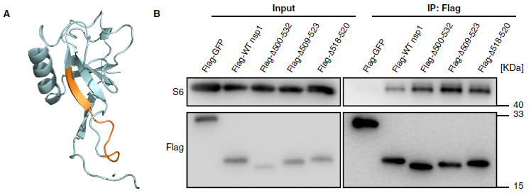 SARS-CoV-2 Nsp1的C端結構域與40S核糖體亞基結合并干擾mRNA的進入,但實驗發現突變的SARS-CoV-2 Nsp1保留了與40S核糖體亞基的結合能力(圖5B)。
