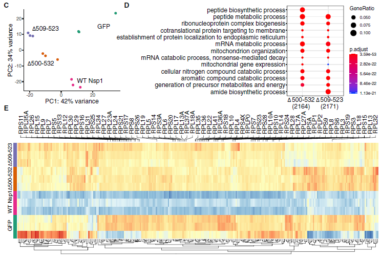 GO富集分析發現,與WT Nsp1相比,突變體Nsp1在生“肽的生物合成/代謝過程”,“核糖核蛋白復合生物發生”,“靶向膜/內質網的蛋白質”,“mRNA代謝過程”和“無意義介導的衰變”等方面顯著上調,符合報道的SARS-CoV-2 Nsp1的功能(圖5D)。