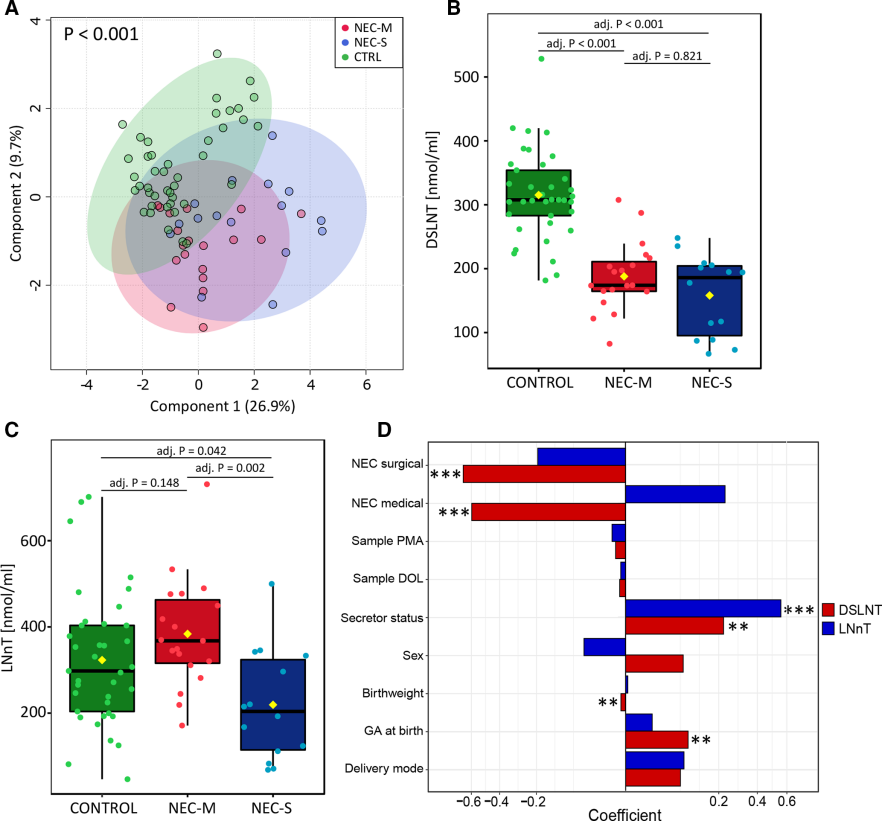 作者比較了未接受手術的NEC-M和接受手術的NEC-S。NEC-M和NEC-S聚類到一起與對照組分離(圖2A)。兩種HMOs顯著不同,與對照組相比NEC-M和NEC-S組的DSLNT均較低(圖2B)。此外,與NEC-M組和健康對照組相比NEC-S組MOM中LNnT顯著降低(圖2C)。