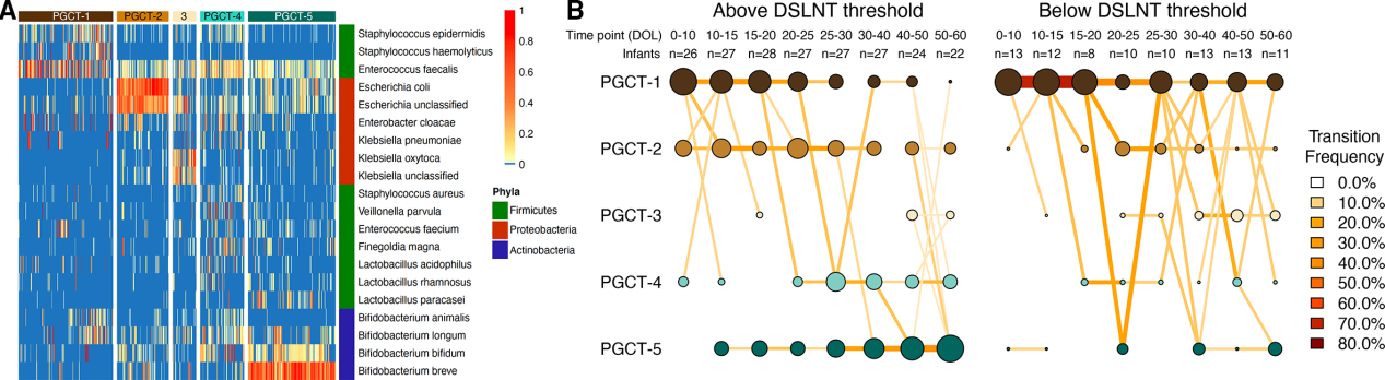采用種水平數據對PGCTs進行DMM聚類,5種PCGTs最理想(圖4A)。PGCT-1特征菌是高豐度Staphylococcus?spp和Enterococcus faecalis,PGCT-2高豐度Escherichia?spp,PGCT-3高豐度Klebsiella?spp,PGCT-4和PGCT-5高豐度Bifidobacterium?spp,B. breve在PGCT-5豐度高。根據樣本在所有時間點和clusters上的分布,在出生后前70天內接受MOM中DSLNT高于和低于241nmol/ml的嬰兒微生物組差異顯著(圖4B)。在校正組間抽樣頻率不均勻后,最后一個時間點接受MOM超過DSLNT閾值2倍的嬰兒類似于PGCT-5,其Bifidobacterium高豐度(圖4A)。