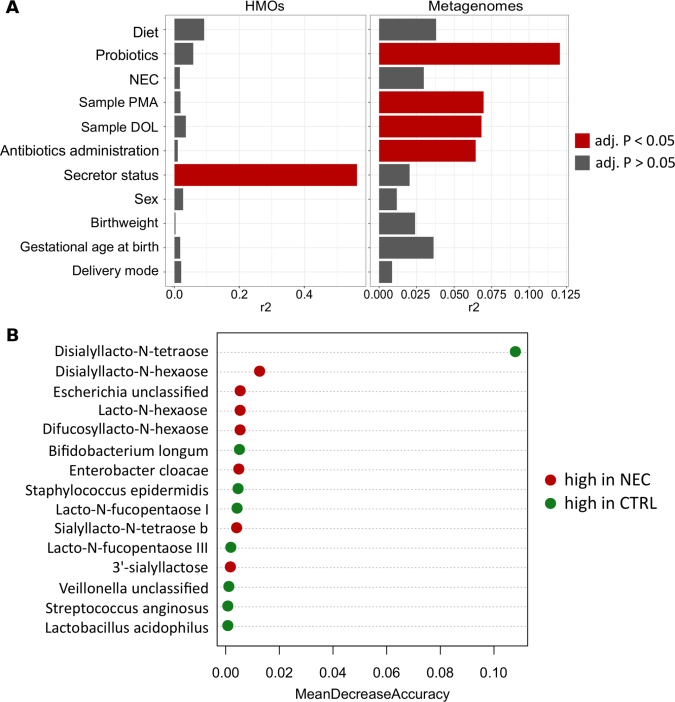結果:相比對照組,NEC患兒母親母乳中HMO和DSLNT濃度顯著降低。MOM閾值為241nmol/ml對NEC的敏感性和特異性為0.9。NEC發病前的宏基因組測序顯示,NEC患兒Bifidobacterium longum相對豐度降低,Enterobacter cloacae相對豐度升高。低MOM DSLNT影響微生物組的縱向發展,這與過渡到以雙歧桿菌為主的早產兒腸道菌群類型的減少有關,通常在年齡大一些的嬰兒中觀察到。疾病前HMO和宏基因組數據結合隨機森林分析區分嬰兒健康或是NEC準確度為87.5%。