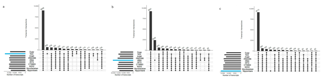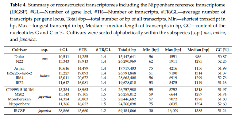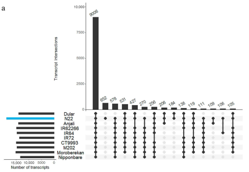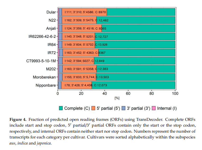 在過去的幾年里,RNA測序(特別是基于illumina的短序列RNA-seq)已經成為分析轉錄組的有力工具,用來識別在非脅迫控制和各種環境脅迫條件下差異表達的基因。然而,需要基于參考基因組或轉錄組序列對RNA-seq數據進行比對和注釋來確定轉錄水平。在水稻中,參考基因組決定了可以鑒別的差異表達基因和轉錄本亞型。顯然,參考基因組/轉錄組中沒有的基因的表達信息在分析過程中會丟失。這在研究耐脅迫的外來品種、陸地品種或野生稻種時尤其相關,因為它們可能含有參考品種Nipponbare不存在的耐受基因。這將嚴重限制識別支持作物改良計劃的新候選基因的可能性。