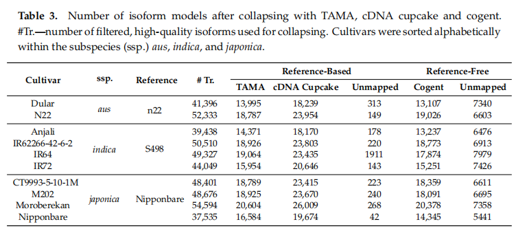 在文庫準備過程中,會產生5 ‘ RNA降解產物,并進行測序。這些降解產物具有相同的外顯子結構,但缺乏5 ‘序列信息,因此產生與技術偏差或生物學背景無關的冗余異構體。我們測試了三種不同的去冗余方法,包括cogent、cDNA cupcake和TAMA,其中cDNA cupcake和TAMA需要基于參考基因組,而cogent不需要基于參考基因組。cogent基于pacbio全長轉錄本序列重構一個參考基因組,然后將相同的序列比對到重建的基因組,基于比對結果利用cDNA cupcake算法對轉錄本去冗余。cDNA cupcake和TAMA直接用minimap2軟件和各自的亞種參考基因組進行比對。基于這三種方法,只有很少的轉錄本不能回比到基因組上(表3)。總的來說,這三種去冗余方法均能顯著減少異構體的數量,分別為47.6% (cDNA cupcake,Nipponbare)和68.3%(cogent,Dular)。