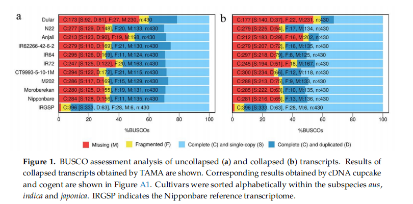 基于植物中430個高度保守的同源蛋白利用BUSCO軟件對TAMA算法去冗余前后的HQ進行完整性評估(圖一),由于取樣不完全,缺失了54%~27%的重要蛋白,其中Nipponbare參考基因組(IRGSP)只缺失了6種。cDNA cupcake和TAMA的結果相似,而對于cogent,超過50%的蛋白缺失,最有可能的原因是轉錄本沒有回比到重建的基因組。