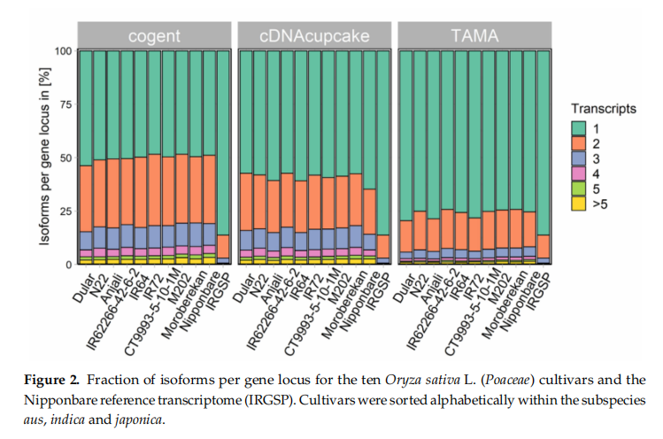 本文主要探討了Pacbio Iso-Seq獲得的轉錄本相比于Nipponbare參考基因組是否可以用于aus等水稻亞種的下游分析。此外通過這些轉錄本,我們希望發現水稻非生物脅迫下新的轉錄本和基因。我們的分析表明所有品種都可以鑒定出特異的轉錄本,還確定了aus亞種特異的差異表達基因。Pacbio Iso-Seq這種方法適用于其它沒有基因組或者基因組質量不高的物種,相比對基因組組裝,這種方法更省時便宜。