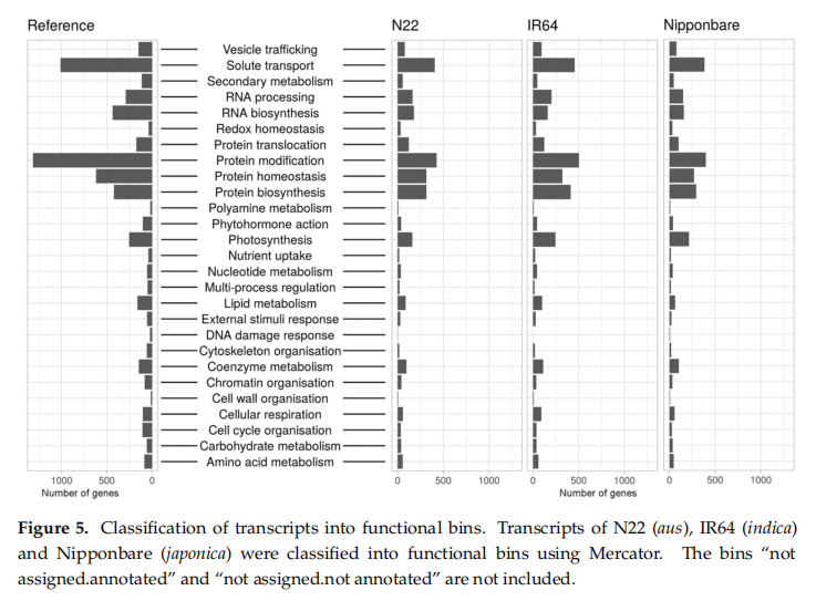 使用Trinotate和Mercator4進行功能注釋。Mercator4是專門為植物開發的,它使用了一種簡單的層次樹結構,被稱為“容器”,用來描述生物學概念。主要的生物過程如光合作用,都是由頂層的容器來表示的,每個子容器描述的是一個更詳細的子過程。目前本體包括27個功能類別,代表了植物中不同的生物過程。N22、IR64和Nipponbare三個品種作為各自亞種的代表與植物中所有水稻基因的分類進行比較分析,結果顯示三個品種的注釋結果分布相似(圖5)。超過28000個水稻已知基因在Mercator庫中沒有注釋分類信息,因此三個品種有8000~10000個轉錄本沒有分類注釋到Mercator庫。