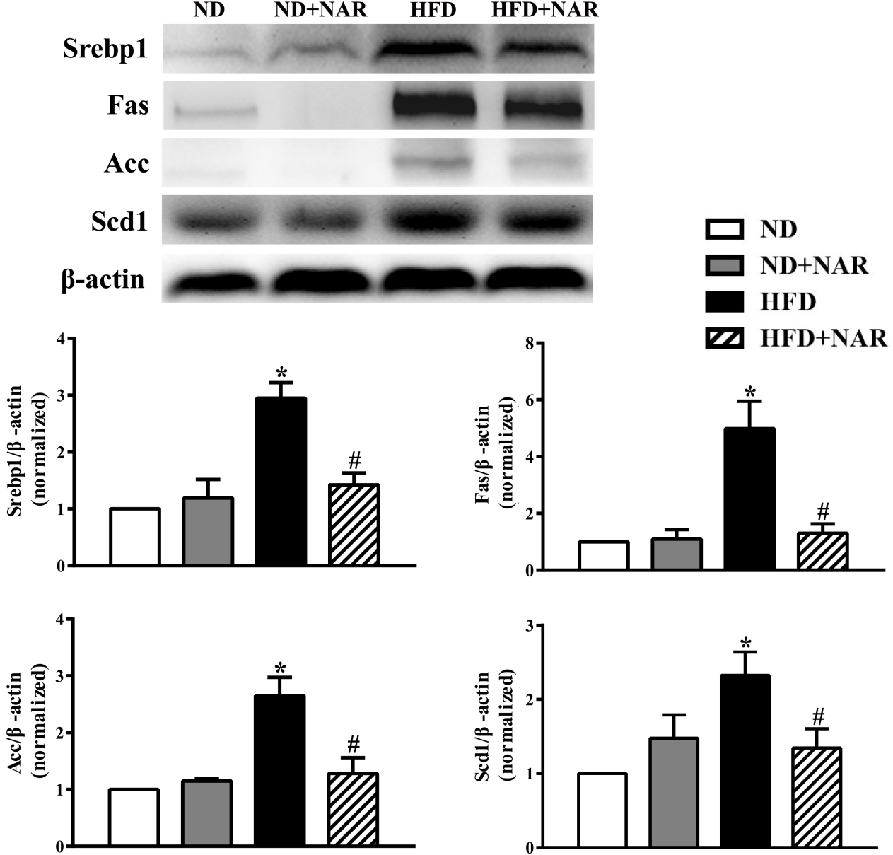 圖4 NAR對(duì)高脂小鼠肝臟脂肪生成相關(guān)蛋白表達(dá)的影響