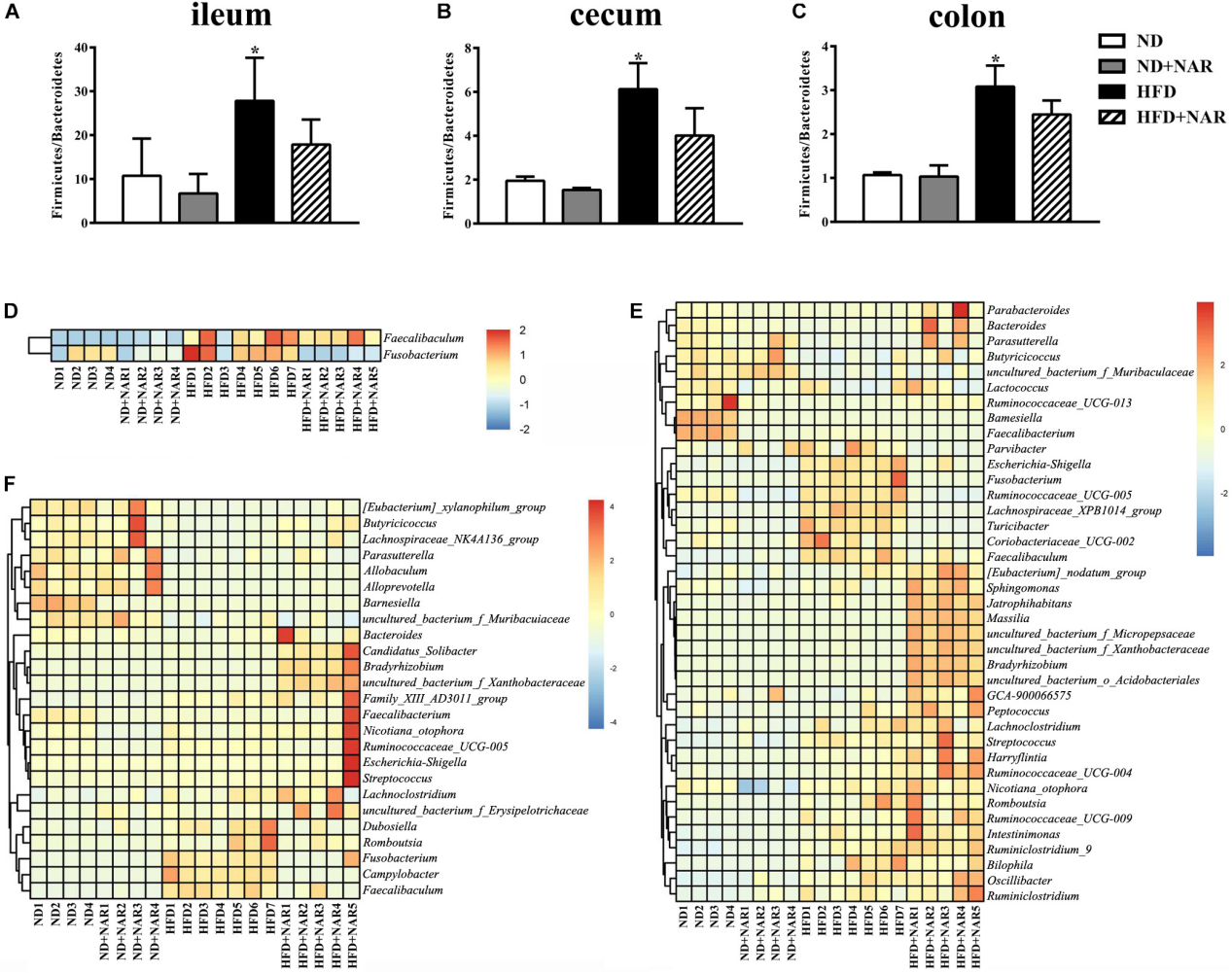 PCoA分析顯示,各處理組回腸、盲腸和結(jié)腸中細(xì)菌組成具有明顯差異(圖5C-E)。與ND組相比,HFD增加了厚壁菌門(mén)/擬桿菌門(mén)(Firmicutes/Bacteroidetes)比值,HFD+NAR組NAR增加了厚壁菌門(mén)/擬桿菌門(mén)比值(圖6A-C)。因此NAR影響了腸道菌群組成。