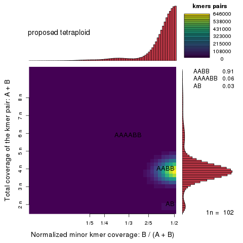 Figure 4一個四倍體的smudgeplot分析結(jié)果,橫軸是雜合k-mer對的深度占總深度的比例,縱軸是所有k-mer對的總深度,二者的交點(diǎn)即代表了不同的雜合結(jié)構(gòu)。交點(diǎn)的亮度代表了落入其中的k-mer數(shù)。