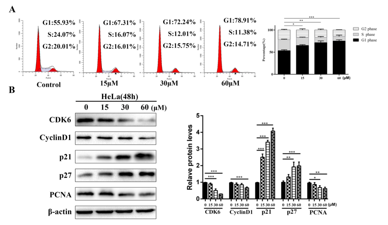 為了研究α-Cyperone是否抑制HeLa細胞的細胞周期進程,作者用不同濃度(0、15、30和60μM)的α-Cyperone處理細胞24小時,然后收集細胞進行細胞周期分析。結果表明,α-Cyperone處理使G1期細胞百分率增加,G1期細胞百分率分別增加6.17%、15.20%和21.30%(圖2A)。采用westernblot檢測cdc25A、cyclind1、CDK6、PCNA、p21和p27的表達水平,進一步探討α-Cyperone對G1細胞周期阻滯的作用機制。作者發現α-Cyperone下調cdc25A、cyclind1、CDK6和PCNA蛋白水平,同時上調p21和p27蛋白表達(圖2B)。