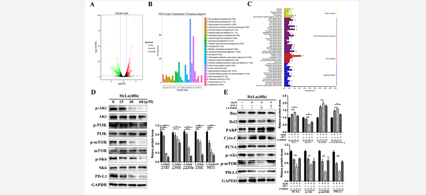 結果表明,α-Cyperone能抑制HeLa細胞的增殖并誘導其凋亡。從機制上講,α-Cyperone通過線粒體凋亡途徑促進HeLa細胞凋亡,細胞內活性氧(ROS)水平升高,細胞色素c、半胱氨酸蛋白酶-3、PARP和Bax的表達上調。進一步的RNA測序顯示α-Cyperone抑制HeLa細胞PI3K/Akt/mTOR信號通路的激活,PI3K抑制劑和激動劑證實了這一點。PI3K抑制劑(LY294002)與α-Cyperone協同抑制HeLa細胞的生長,而PI3K激動劑(IGF-1)則消除了這種作用。有趣的是,α-Cyperone和LY294002均能抑制PD-L1的表達,而IGF-1的補充則能挽救PD-L1的低表達。綜上所述,作者的研究結果揭示了α-Cyperone對HeLa細胞生長的抑制作用是通過ROS介導的PI3K/Akt/mTOR信號通路觸發的,并且與PD-L1表達的下降密切相關。