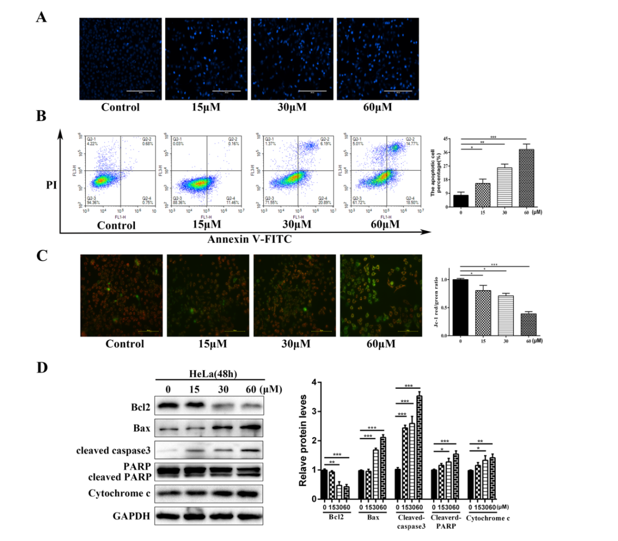線粒體膜電位的變化是細胞凋亡的典型事件(Suhaili et al.,2017)。在細胞凋亡過程中,線粒體膜被破壞,線粒體膜電位去極化,這可以通過降低JC-1實驗中紅綠色熒光強度比來衡量。如圖3C所示,α-Cyperone誘導線粒體膜電位的劑量依賴性喪失。為了進一步證實凋亡細胞的死亡,作者檢測了細胞色素c、半胱氨酸蛋白酶-3、Bax、Bcl-2和PARP的蛋白表達。如圖3D所示,α-Cyperone處理顯著增加細胞色素c、caspase-3、PARP和Bax的表達。相反,Bcl-2表達降低。這些結果表明α-Cyperone通過線粒體凋亡途徑誘導HeLa細胞凋亡。