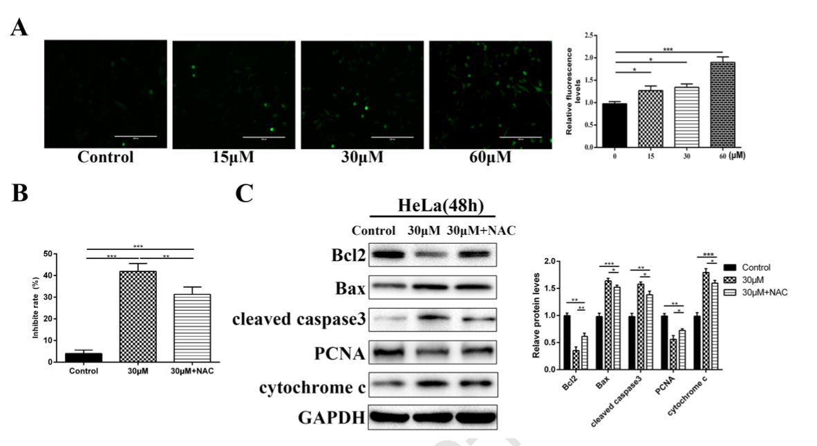 如圖4A所示,在濃度分別為15、30和60μM的α-Cyperone作用48小時后,Hela細胞產生的細胞ROS分別增加到30.12%、37.30%和94.67%。然后,作者進一步確定ROS抑制劑(N-乙酰半胱氨酸,NAC)預處理是否能保護HeLa細胞免受α-Cyperone的細胞毒作用。如4B所示,與α-Cyperone單獨治療組相比,NAC和α-Cyperone聯合治療可顯著降低細胞色素c、Bax的表達,增加PCNA和Bcl-2的表達。結果表明,α-Cyperone誘導HeLa細胞生長抑制是通過破壞氧代謝平衡實現的。