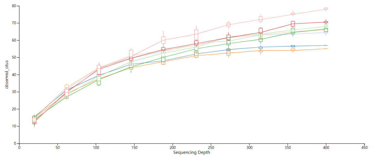 稀釋性分析:用于驗證測序數(shù)據(jù)量是否足以反映樣品中的物種多樣性,并間接反映樣品中物種的豐富程度。在一定范圍內(nèi),隨著測序條數(shù)的加大,若曲線表現(xiàn)為急劇上升則表示群落中有大量物種被發(fā)現(xiàn);當(dāng)曲線趨于平緩,則表示此環(huán)境中的物種并不會隨測序數(shù)量的增加而顯著增多