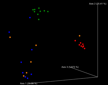 PCoA分析:原理是假設(shè)對N個樣品有衡量它們之間差異或距離的數(shù)據(jù),就可以用此方法找出一個直角坐標(biāo)系,將N個樣品表示成N個點,而使點間的歐式距離的平方正好等于原來的差異數(shù)據(jù),實現(xiàn)定性數(shù)據(jù)的定量轉(zhuǎn)換,從多維數(shù)據(jù)中提取出主要的元素和結(jié)構(gòu)。