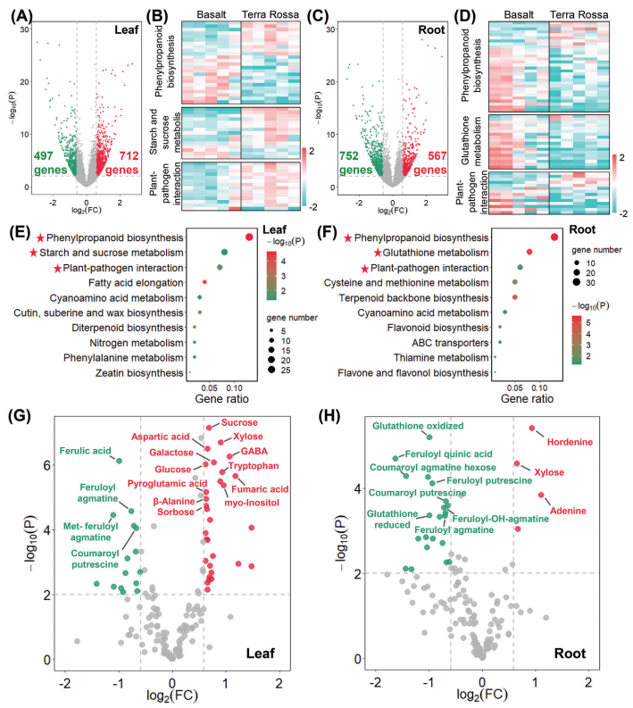(A、C)葉片和根中差異表達基因(DEGs)的火山圖。(B、D)deg的熱圖。E,F)葉和根中DEGs的KEGG富集。(E,F)葉和根中DEGs的KEGG富集。(G,H)代謝物水平倍數變化的火山圖。