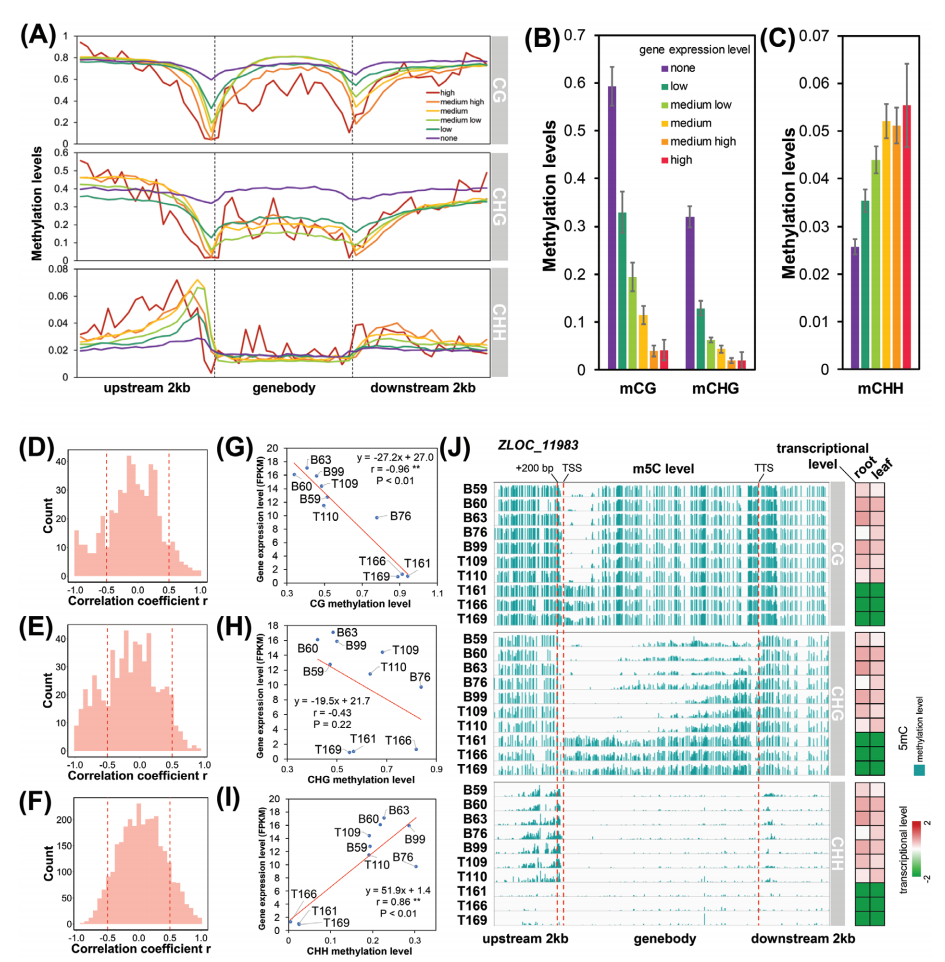 (A)被不同表達水平劃分的基因內和側翼的甲基化水平。(B)TSS上游100bp的平均CG和CHG甲基化水平。(C)平均CHH甲基化水平TSS上游1000~200bp的水平。(D-F)m5C水平(D、mCG、E、mCHG、F、mCHH)與轉錄水平之間的Pearson相關系數分布。(G-I)m5C水平(G、mCG、H、 mCHG、I、mCHH)與ZLOC_11983轉錄水平的相關性分析。(J)m5C水平和ZLOC_11983的轉錄水平。