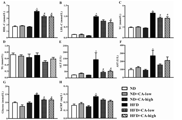 ? ? ? ? ?血清TC、TG、HDL-C和LDL-C升高是HFD組小鼠的主要特征。同樣,HFD組小鼠血清TC、HDL- C、LDL-C水平明顯升高,提示小鼠出現(xiàn)高脂血癥。CA處理在低和血清TC、TG、HDL-C和LDL-C升高是HFD組小鼠的主要特征。同樣,HFD組小鼠血清TC、HDL- C、LDL-C水平明顯升高,提示小鼠出現(xiàn)高脂血癥。CA處理在低和低濃度的TC、HDL-C和LDL-C對(duì)hfd誘導(dǎo)的血清高脂血癥有緩解作用。但各組間血清TG水平無(wú)顯著差異(圖2A-D)。在HFD組中,ALT、AST、葡萄糖和hsCRP水平均升高,而在喂食HFD的小鼠中,添加兩種濃度的CA只恢復(fù)了血清中ALT和葡萄糖(圖2E-H)。添加CA的ND小鼠與只添加ND的小鼠表現(xiàn)出幾乎相同的結(jié)果。