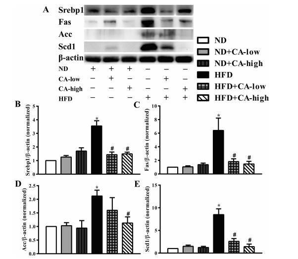 3.補(bǔ)充CA可調(diào)節(jié)高脂喂養(yǎng)小鼠脂肪生成相關(guān)蛋白表達(dá)