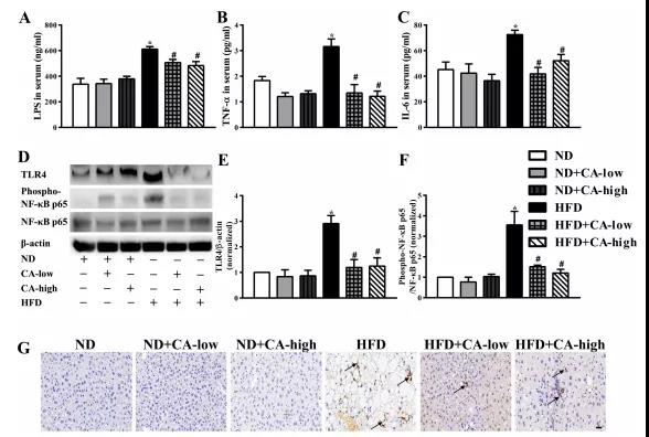 有報(bào)道稱,NAFLD的特征是腸道菌群改變、炎癥和腸道屏障破壞。肝組織炎癥被認(rèn)為是肝脂肪變性發(fā)展的驅(qū)動(dòng)因素,腸道源性脂多糖被認(rèn)為在肝臟炎癥中具有致病作用。最近的動(dòng)物實(shí)驗(yàn)研究關(guān)注了腸道菌群LPS在NAFLD發(fā)生中的作用。腸道源性LPS是革蘭氏陰性菌外膜的主要成分,通過(guò)TLR4信號(hào)通路和下游炎癥級(jí)聯(lián)反應(yīng)促進(jìn)炎癥反應(yīng)。有報(bào)道稱,在NAFLD模型中,與野生型小鼠相比,tlr4缺陷小鼠的肝損傷、炎癥和脂質(zhì)積累減少。此外,阻斷腸道菌群與宿主細(xì)胞之間的脂多糖- tlr4相互作用可以阻止高脂喂養(yǎng)小鼠NAFLD的啟動(dòng)和發(fā)展,這證實(shí)了脂多糖- tlr4通路在誘導(dǎo)NAFLD中具有非常重要的作用。與之前的研究結(jié)果一致,我們的研究表明,16周高脂飲食導(dǎo)致血清LPS和肝臟TLR4表達(dá)顯著增加,肝組織中磷酸化的NF-kB p65被激活,表明炎癥開(kāi)始。同時(shí),高脂喂養(yǎng)小鼠血清TNF-a、IL-6水平升高,肝臟mpo陽(yáng)性細(xì)胞浸潤(rùn)。所有劑量的CA補(bǔ)充均顯著扭轉(zhuǎn)了上述現(xiàn)象;在添加ca的ND組中沒(méi)有觀察到顯著差異(圖4A-G)。
