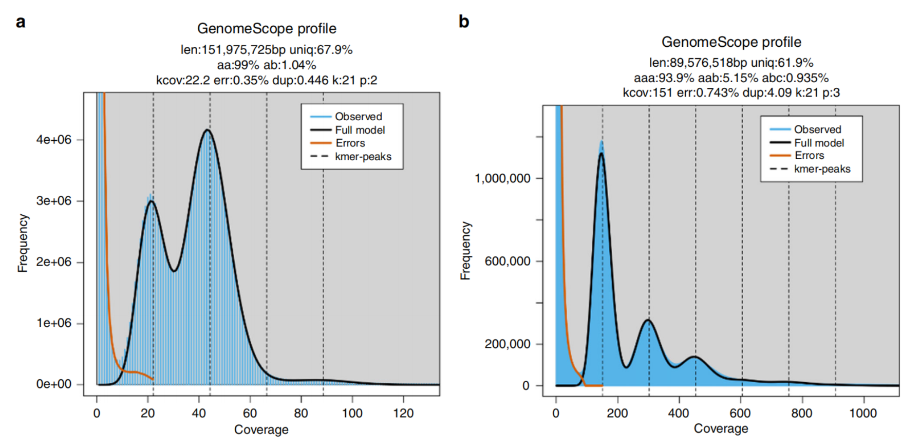 ? ? ? ?但僅知道物種大小是遠(yuǎn)遠(yuǎn)不夠的,現(xiàn)在為了完成更高質(zhì)量基因組組裝通常需要選擇不同類(lèi)型的材料。例如為了構(gòu)建0?Gap的高連續(xù)性基因組,會(huì)選擇超高純合度的材料(通過(guò)自交純合或是花藥培養(yǎng)等)來(lái)降低組裝中的障礙。亦或是為了完成二倍體基因組雙單倍體的組裝,選擇超高雜合度的材料(例如遠(yuǎn)緣雜交或是野生材料篩選等)來(lái)增加基因組中同源對(duì)的差異,從而進(jìn)行區(qū)分與組裝。
