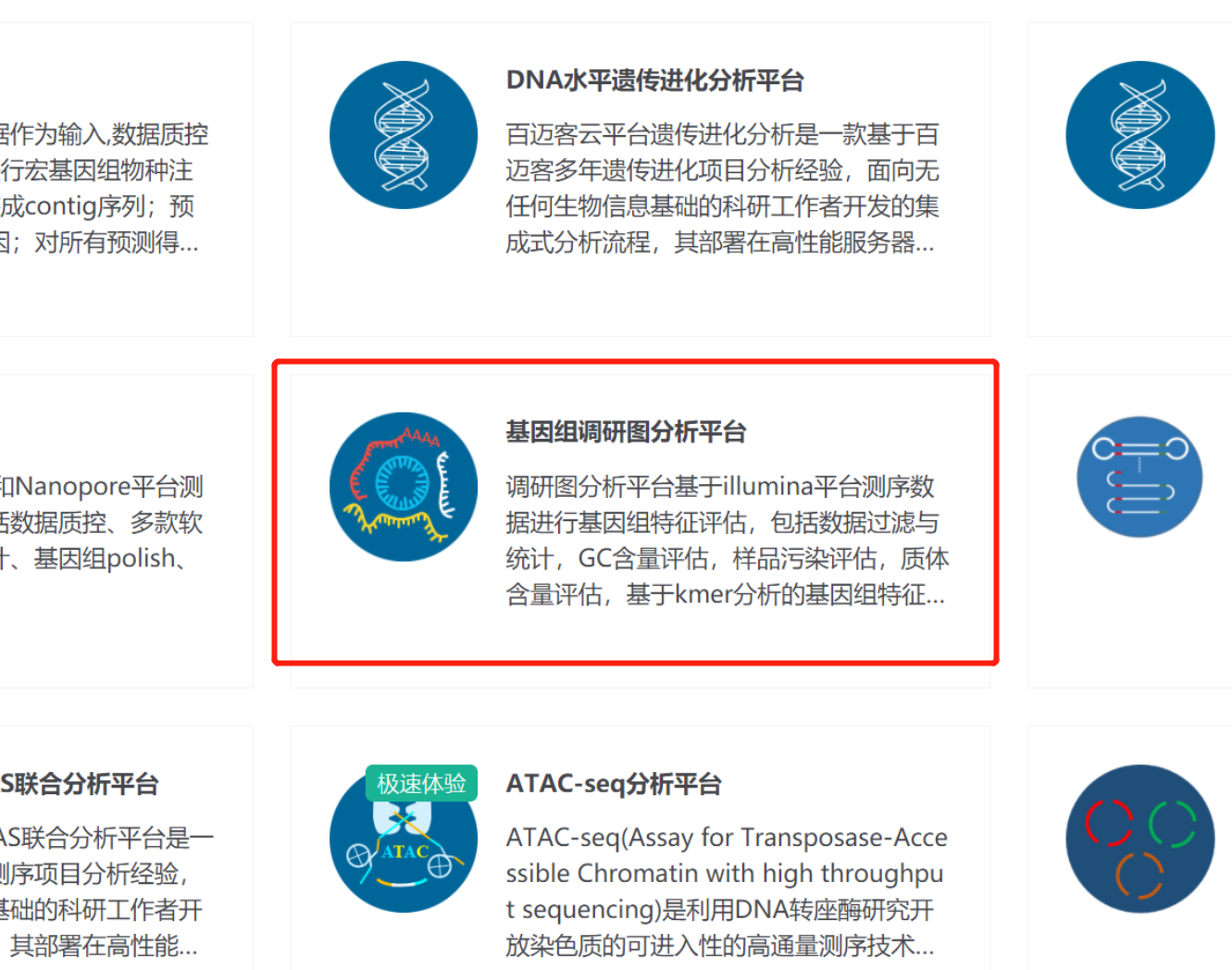 (1)從百邁客官方云平臺(tái)登錄即可找到基因組調(diào)研圖分析平臺(tái)APP界面。百邁客云平臺(tái)網(wǎng)址:http://www.biocloud.net/