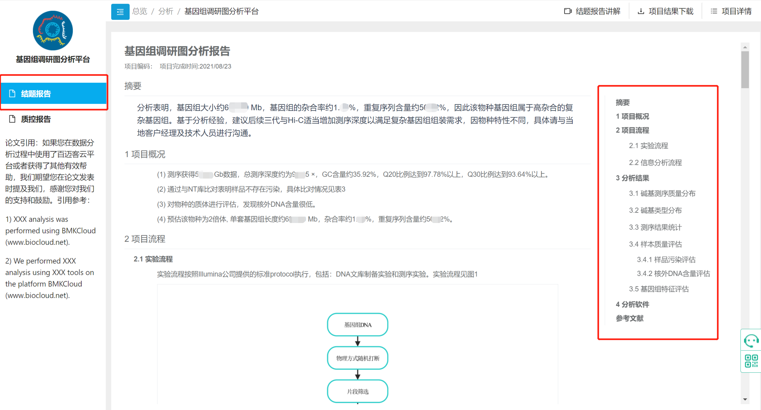 分析完成即可在線查看項(xiàng)目結(jié)題報(bào)告與數(shù)據(jù)質(zhì)控報(bào)告。報(bào)告將對(duì)整體數(shù)據(jù)質(zhì)量、污染評(píng)估、基因組特征、使用軟件版本等進(jìn)行詳細(xì)描述。具體可見(jiàn)下圖右部目錄。