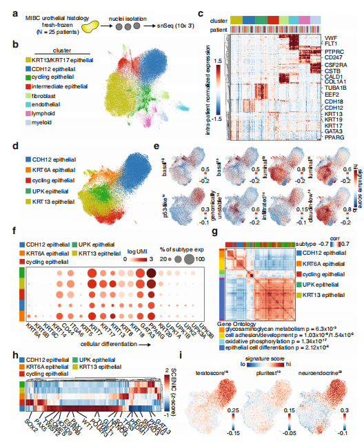 為了實現表征腫瘤內異質性的第一個目標,作者首先基于sn-RNAseq細胞類型比例研究了MIBC腫瘤的總體細胞組成(圖1a)。腫瘤由約90%的上皮細胞、5%的免疫細胞、3%的成纖維細胞和2%的內皮細胞組成,這些細胞根據相應的角蛋白、PTPRC、膠原蛋白、PECAM1、VWF等關鍵標記基因(圖1b)。上皮間室無監督聚類識別到了一個KRT13和KRT17差異表達的類群,KRT13、uroplakins(UPK)、KRT6A細胞周期相關基因類群,以及表達CDH12和其他上皮標記物的細胞群(圖1d)。KRT13和UPK人群是僅有的兩個缺乏來自免疫浸潤MIBC的基因標記的人群,這表明在這些人群中富集的腫瘤代表免疫“冷”腫瘤(圖1e)。進一步交叉參照傳統的尿上皮分化相關標記表明,KRT13和UPK群體代表一個更分化的表型,而CDH12、KRT6A和cycle群體代表一個未分化或去分化的表型(圖1f)。如預期一樣KRT13和UPK群體表達了一個上皮細胞分化網絡(圖1g)?;趩渭毎{控網絡推斷和聚類分析,預測CDH12群體表現出多種發育相關轉錄因子的高活性,包括NANOG、EOMES、PAX1和HOXD9(圖1h)。CDH12和循環群體在干-樣和神經內分泌基因標簽得分也高(圖1i)。