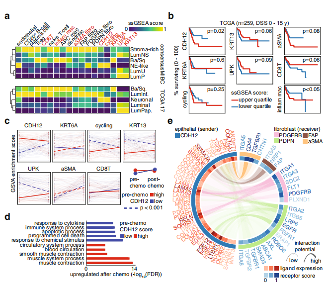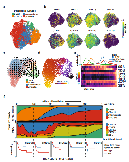 上皮細胞的無監督聚類分為基礎、過渡和傘部類群(圖2a)。有趣的是CDH12群體與后一類典型群體明顯不同,而過渡群體的KRT13和KRT17表達水平最高(圖2b)。確定了一個始于基礎細胞的軌跡,隨后分化為兩種途徑:一種貫穿CDH12群體,一種跳過CDH12群體(圖2c和d)。關鍵的尿上皮分化標記物沿著這條路徑跟蹤,在起始階段CD44高表達,隨后中間是KRT13和KRT17,終點站為UPK1A、GATA3、PPARG(圖2e)。所有4個正常樣本的擬時序分析顯示出相似的路徑,CDH12群位于起始點附近(圖2f)。為了確定CDH12腫瘤細胞與正常腫瘤細胞之間的轉錄相似性,并推斷它們在正常上皮細胞分化軌跡上的位置,作者使用表達相似性,確定了每個MIBC上皮細胞中最接近的正常細胞,然后給腫瘤細胞分配相應的正常潛伏期(圖2f)。值得注意的是,最未分化表型對應的間隔得分預測了較差的疾病特異性生存(DSS),而最分化表型對應的間隔得分預測了較好的DSS,中間的間隔得分顯示了相反結果之間的過渡(圖2f)。