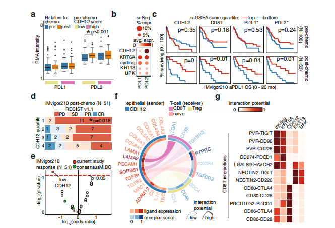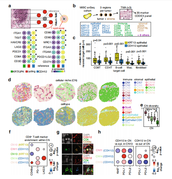 為了驗證CDH12上皮細胞引起T細胞假說,作者使用Visium空間轉錄組和單細胞核轉錄組研究腫瘤中基因表達定位。CDH12富集的區域也富集了CD8T細胞marker和ITGA1(圖5a)。為了驗證CDH12上皮細胞在單細胞水平上與T細胞共定位,作者設計并使用CODEX平臺對同一腫瘤隊列的腫瘤組織微陣列進行了35位免疫組化檢測(圖5b)。