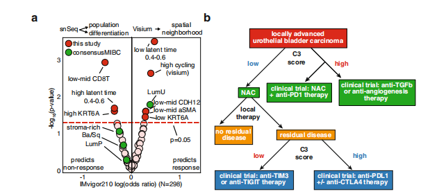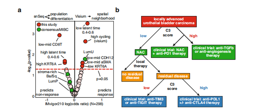 膀胱癌患者接受免疫治療后預后效果的好壞仍然是臨床上面臨的一個主要的挑戰。近期NC一篇文章通過單細轉錄組及空間轉錄組闡述了對膀胱癌治療具有反應應答的癌細胞群。獲得了在預測對免疫治療的反應方面更優的marker基因。有助于為患者的治療提供更理想更優的治療方案。