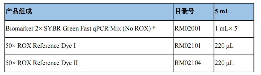Biomarker 2× SYBR Green Fast qPCR Mix采用SYBR? Green I 嵌合熒光法進行qPCR反應,通過對SYBR? / FAM通道進行熒光信號定量檢測,可以獲得PCR過程中DNA擴增的真實數據。Taq DNA酶采用抗體法熱啟動進行擴增,可以有效抑制引物退火導致的非特異性擴增,極大地提高產品的特異性。且試劑盒中含有特殊的ROX Reference Dye,適用于所有qPCR儀器。