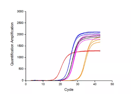 圖3:以1 μg不同物種的RNA為模板(紅色:人肝癌細胞;藍色:雞;黑色:斑馬魚;紫色:水稻種子;黃色:番茄果),用BiomarkerScript Ⅱ 1st Strand cDNA Synthesis Kit進行逆轉錄,得到cDNA產物。再以100 ng不同物種的 cDNA為模板,用Biomarker 2×SYBR Green Fast qPCR Mix進行qPCR擴增。