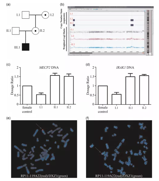 使用SNP微陣列檢測I.1、I.2和II.2的變化。在II.2和I.2(圖1b)中,在Xq28區域和Xq27.3區域分別顯示了437KB的重復和284KB的重復,這表明Xq28和Xq27.3重復是母系遺傳的。Xq28區域包含13個在線孟德爾人遺傳(OMIM)基因(包括MECP2、IRAK1、L1CAM、NAA10和HCFC1)。通過qRT-PCR以驗證結果,在男性I.1中檢測到MECP2和IRAK1一個基因劑量的拷貝,而在正常對照女性中檢測到兩個拷貝,在I.2和II.2中檢測到三個拷貝(圖1c,d)。對女性I.2和II.2的中期染色體進行FISH分析,發現含有MECP2的探針RP11-119A22僅在Xq28處有信號,這表明Xq28重復是串聯的,沒有整合到基因組的其他地方(圖1e,f)。