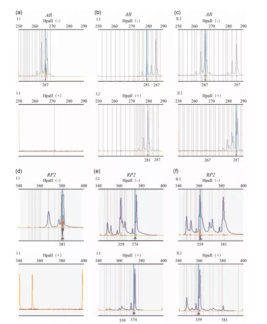 作者進行了基于PCR的AR和RP2分析,以評估外周血中的XCI模式。使用甲基化敏感的限制性內切酶HpaII,使PCR只擴增非活性X染色體上的等位基因。通過分離分析確定了失活X染色體的起源。
