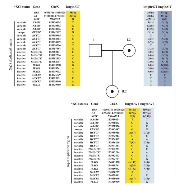 根據AR和RP2分析的結果,I.2中的MECP2重復應該位于活躍的X染色體上。如果兩條X染色體都有缺陷,則具有更有害變體的突變X染色體將完全失活,以避免其不良反應,迫使另一條變得活躍。因此,對于I.2,假設在沒有Xq28重復的X染色體上存在額外的更有害的致病性變體,從而迫使Xq28重復變得活躍。