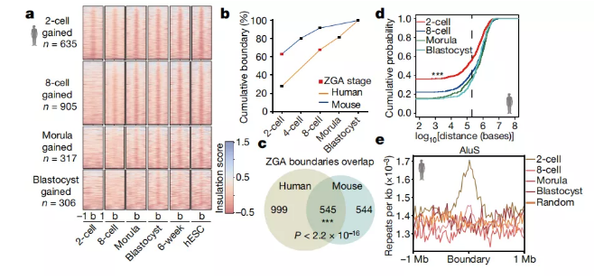 據(jù)報(bào)道,重復(fù)元素與細(xì)胞系中的TAD邊界相關(guān)。因此,作者分析了胚胎中特定于階段獲得的邊界周圍重復(fù)元件的富集。作者的數(shù)據(jù)表明,在人類早期階段,Alu重復(fù)序列(而不是LINE或MIR重復(fù)序列)(圖3e)富集在絕緣邊界周圍。在小鼠胚胎中觀察到了相似的結(jié)果。例如,在人類或小鼠RAB5A基因周圍的2細(xì)胞階段獲得的絕緣邊界被建立在Alu密集區(qū)。此外,作者的數(shù)據(jù)表明AluS元素在2細(xì)胞階段獲得的絕緣邊界周圍高度富集(圖3e)。此外,與其他階段相比,在2細(xì)胞階段獲得的絕緣邊界周圍的AluS重復(fù)序列在裂解階段得到了高度表達(dá)。總體而言,這些結(jié)果表明,人類胚胎中絕緣的邊界傾向定位在Alu密集區(qū)周圍。