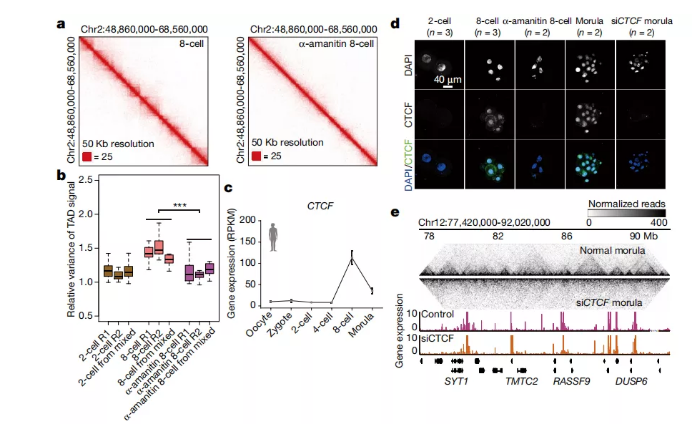 接下來,作者旨在鑒定ZGA期間參與TAD建立的蛋白質(zhì)。粘著蛋白復(fù)合物和CTCF在高階染色體結(jié)構(gòu)中具有重要作用。因此,作者研究了這些蛋白質(zhì)表達(dá)的差異。粘附蛋白復(fù)合物的亞基,例如RAD21,已經(jīng)在ZGA之前在人類胚胎中高度表達(dá)。相比之下,當(dāng)在人類胚胎中首次觀察到TAD結(jié)構(gòu)時(shí),CTCF的表達(dá)在ZGA階段之前非常有限,并且在8細(xì)胞階段急劇增加(圖4c)。在經(jīng)α-amanitin處理的8細(xì)胞胚胎中,CTCF表達(dá)受到抑制。一致地,免疫染色圖像顯示在2細(xì)胞核中幾乎未觀察到CTCF蛋白(圖4d)。CTCF明顯存在于未經(jīng)處理的8細(xì)胞核中,但在經(jīng)α-amanitin處理的8細(xì)胞核中卻不存在(圖4d)。這些結(jié)果表明CTCF表達(dá)需要人ZGA。