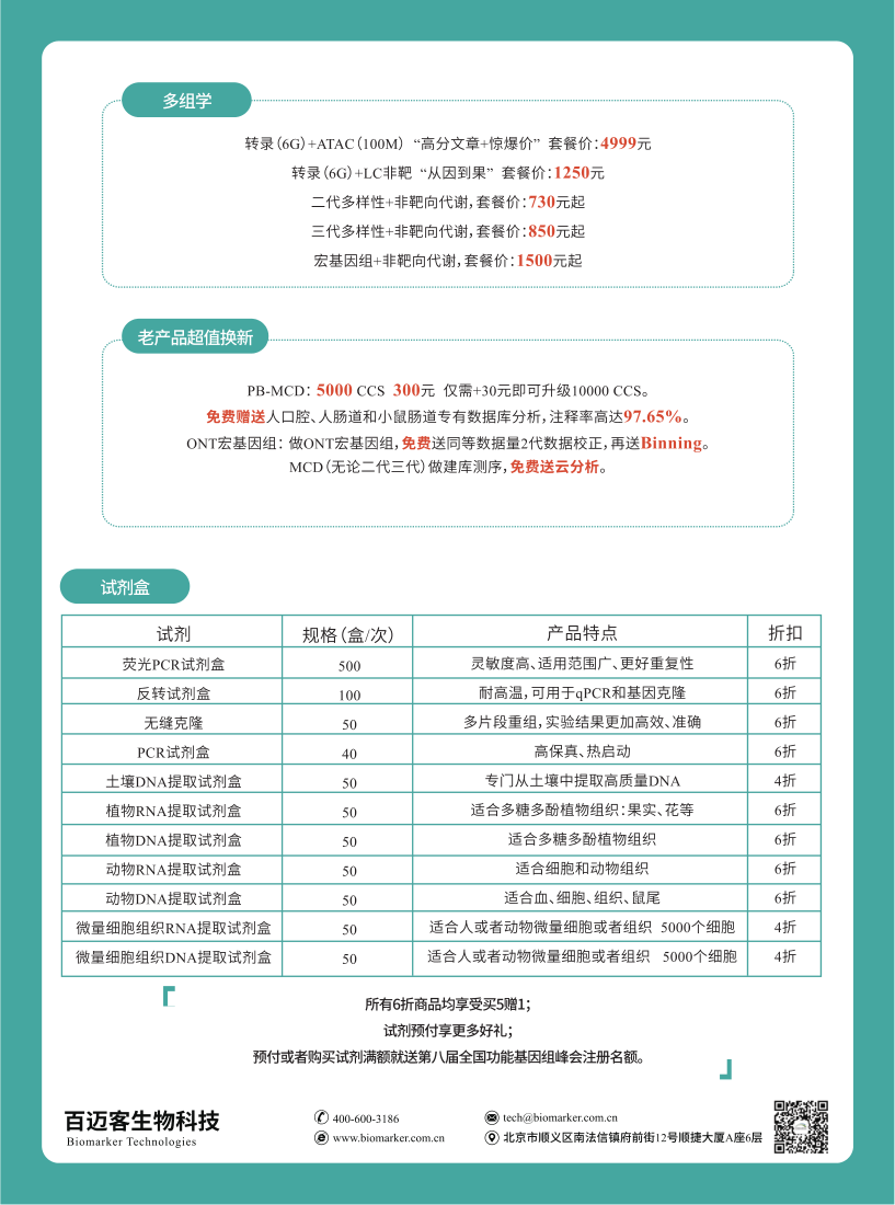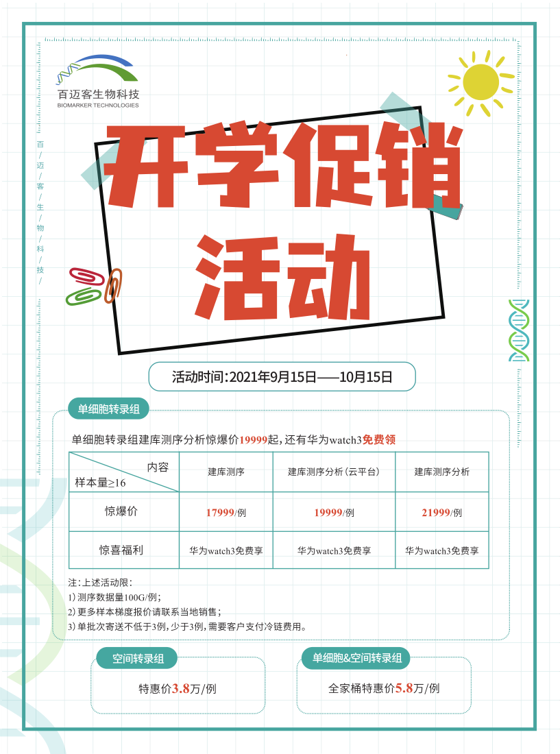 百邁客為您提供了最實惠的開學(xué)季促銷好禮,產(chǎn)品覆蓋二代微生物、三代微生物、微生物多組學(xué)以及單細(xì)胞系列產(chǎn)品,詳情活動可見:百邁客醫(yī)學(xué)開學(xué)促銷活動,快快上車~