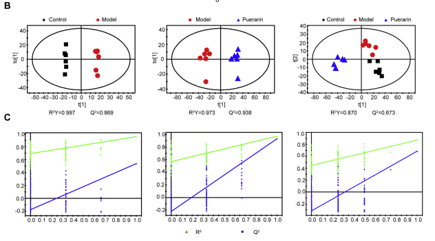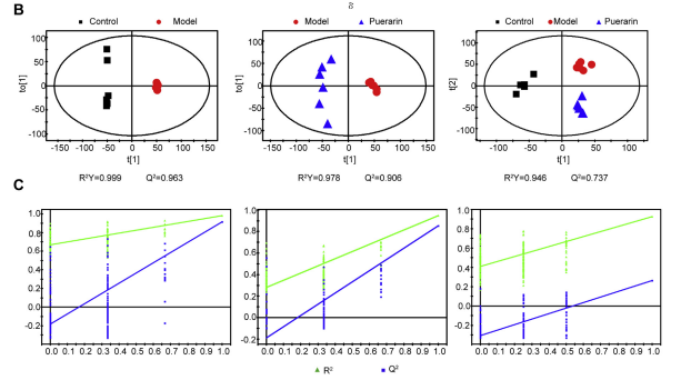 圖3A和圖4a顯示了小鼠肝臟組織和尿液的代表性1H NMR譜圖。為了研究NASH對小鼠代謝紊亂的影響,基于小鼠肝組織和尿液樣本的歸一化核磁共振波譜數(shù)據(jù),計算PCA和OPLS-DA模型,揭示葛根素的干預(yù)作用。觀察到對照組和模型組之間肝臟和尿代謝表型的清晰分離(圖3B, 4b和S1),表明MCD飲食誘導(dǎo)小鼠NASH后發(fā)生了一些顯著的生化變化。此外,PCA 和 OPLS-DA 得分圖揭示肝臟和泌尿代謝的完全分化模型和葛根素組之間的概況以及顯示葛根素組有恢復(fù)到健康對照組的趨勢,這可能歸因于葛根素對NASH的治療效果。兩個模型參數(shù)R2Y 和 Q2 以及置換測試的結(jié)果說明了OPLS-DA 模型的有效性(圖 3C 和 4C)。